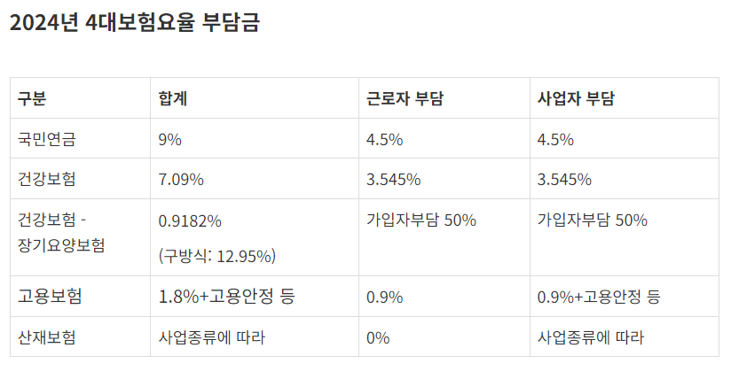 각 보험별로 2024년 요율은 아래와 같습니다.